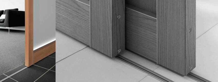 Дверь бывает одностворчатая и двустворчатая, в комплект входят замок и запирающее устройство. Двустворчатые поставляются с синхронизатором, который обеспечивает одновременное передвижение створок (деталь расположена внутри направляющей).