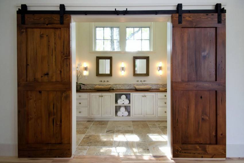 Какие двери лучше ставить в ванную, в этом случае определяется дизайном и пожеланиями владельцев жилья. Допустима арочная или несимметричная форма, оригинальные конструкции с увеличением или уменьшением размеров проема, авторские решения с необычным декором. Большой популярностью пользуется вариант с объединением ванной комнаты и туалета и выполнение единого дверного проема с раздвижной дверью.