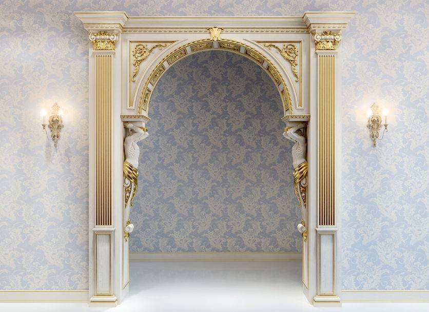 Лепной полиуретановый или гипсовый декор на дверных откосах, с сочетанием изящных линий и легких форм с глубокой рельефностью, наделяет портал воздушной роскошью и добавляет интерьеру некой аристократичности.