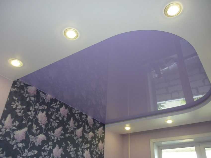 На фото – потолочная поверхность белого натяжного полотна с сиреневыми вставками.