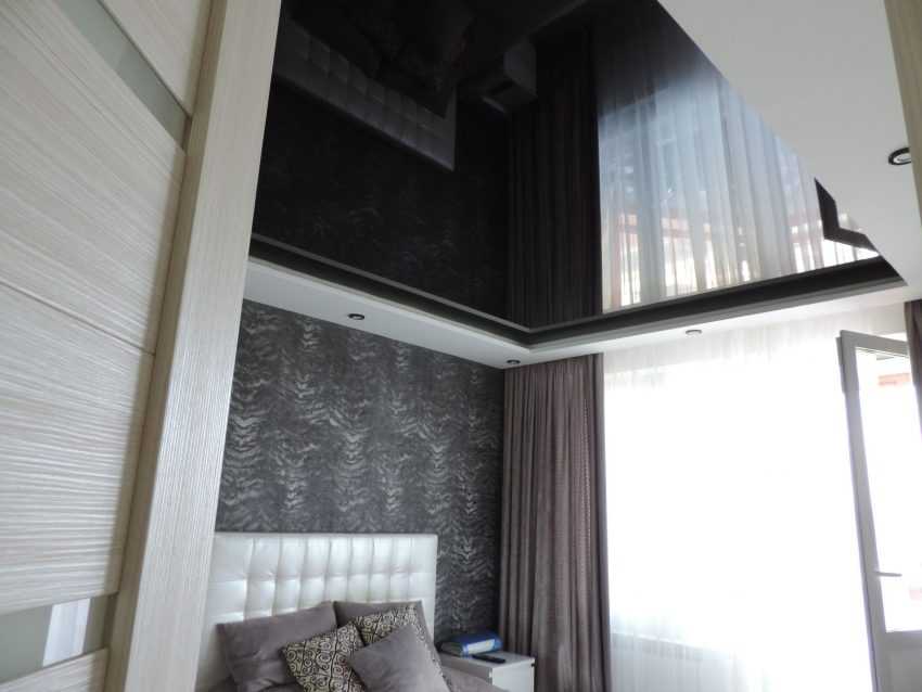 В отличие от описанных ранее матовых потолков, глянцевые прекрасно отражают свет и обладают определенным эффектом, который зрительно увеличивает пространство. Особенно это относится к темным тонам потолка. Они станут интересным вариантом для современного стиля интерьера. Цветовые решения здесь могут быть самыми разнообразными, для минималистичных интерьеров прекрасно подойдет комбинация черного и белого оттенков. Также часто используют игру контрастов светлого и темного.