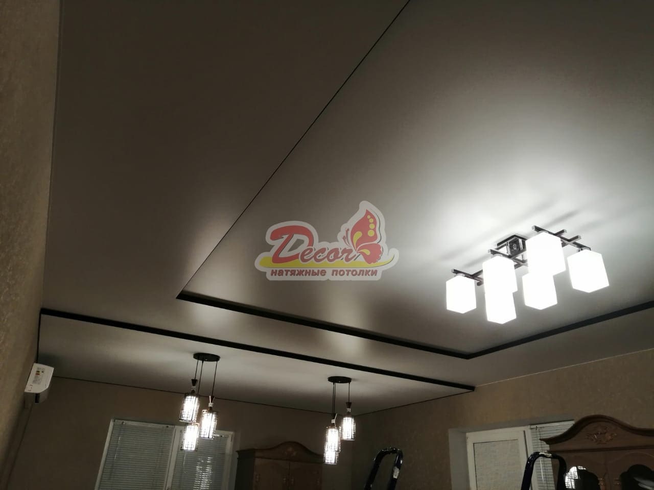 Двухуровневые натяжные модели в сочетании с люстрой создают интересную игру света и визуально делают комнату гораздо выше и шире.