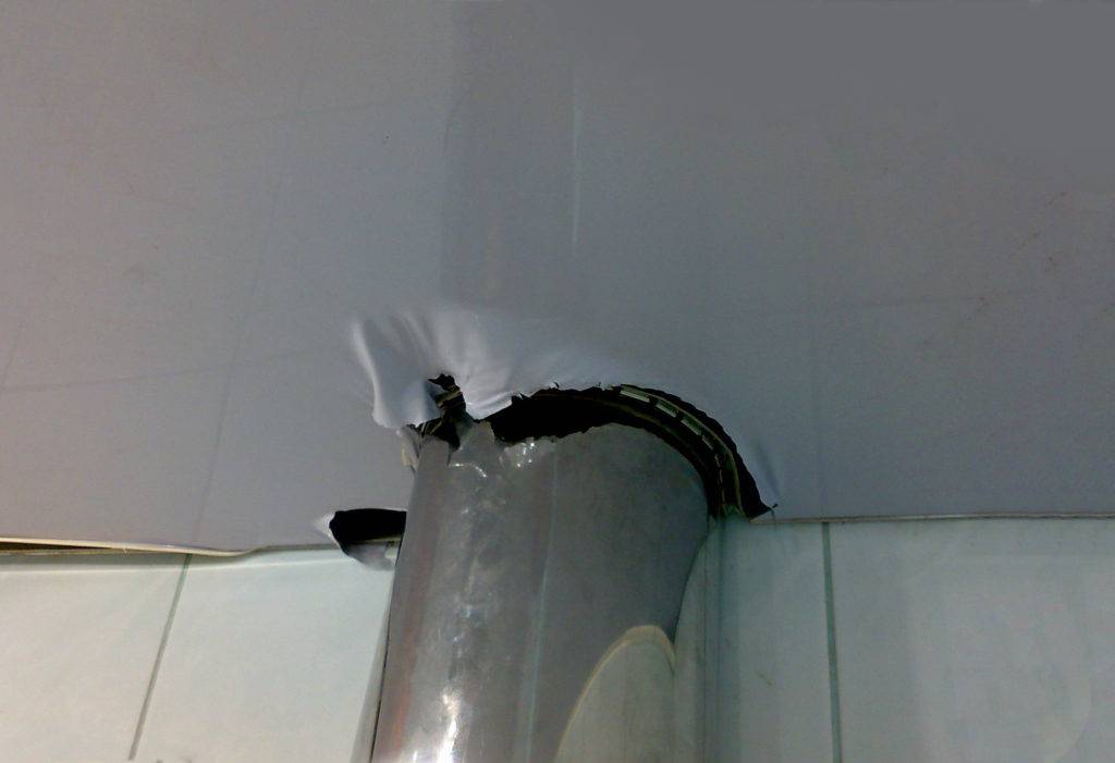 - Разрыв полотнища у трубы отопления . Данные повреждения случаются, например, при замене стояков отопления. Если действовать аккуратно, то прорыва можно избежать. Но если беда все же приключилась, то такое повреждение без опыта не починить. Лучше попросить помощи у профессиональной бригады потолочников или в компании где вы заказывали потолки.
