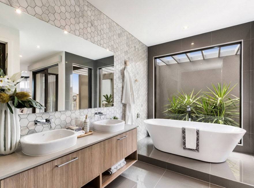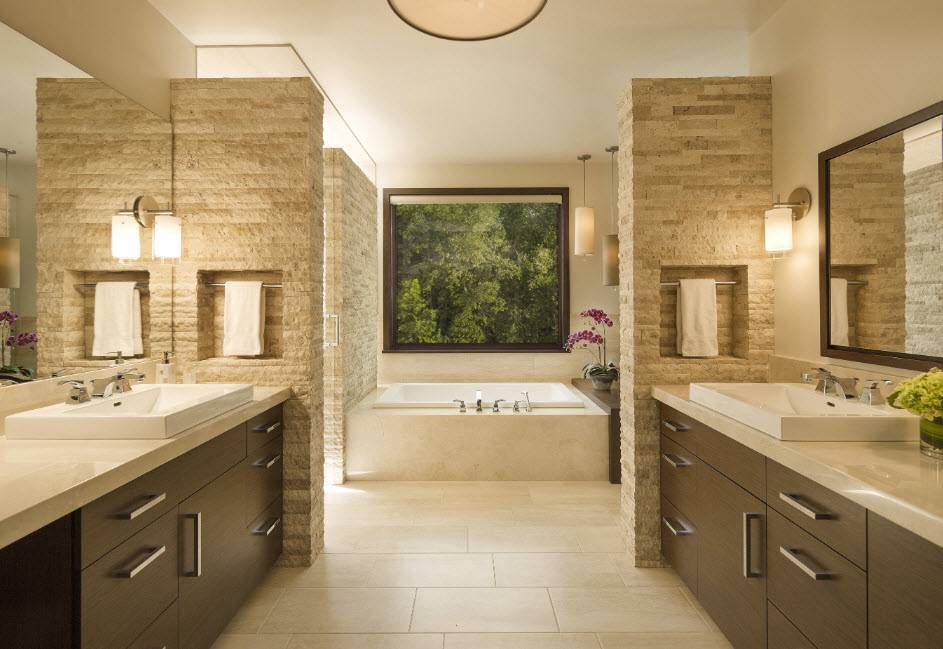 Сделав чашечку чая, можно уделить себе немного времени и насладиться видами из окна. Нельзя пройти мимо раковин в этой роскошной ванной. Пользоваться такими «парными» раковинами одновременно намного удобнее, особенно если вы живете вдвоем.