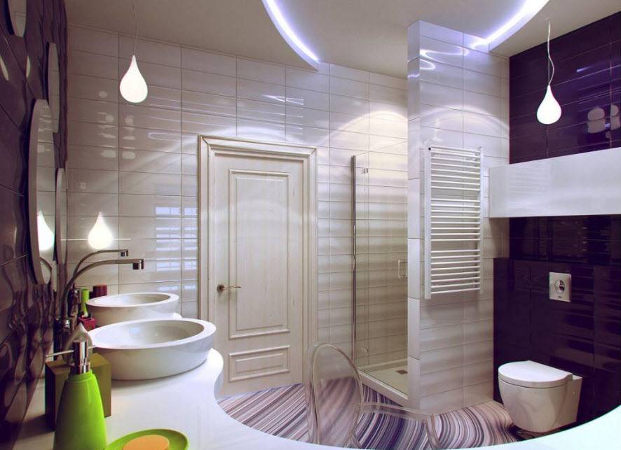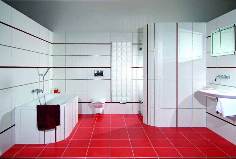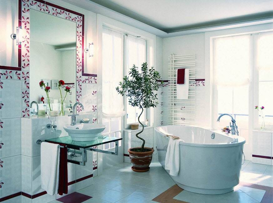 Если же базовым элементом станет простая плитка белого или любого другого спокойно цвета, то стоит разбавить его небольшими яркими красками. Сочетание плитки в ванной в двух цветах всегда смотрится гармонично и стильно.
