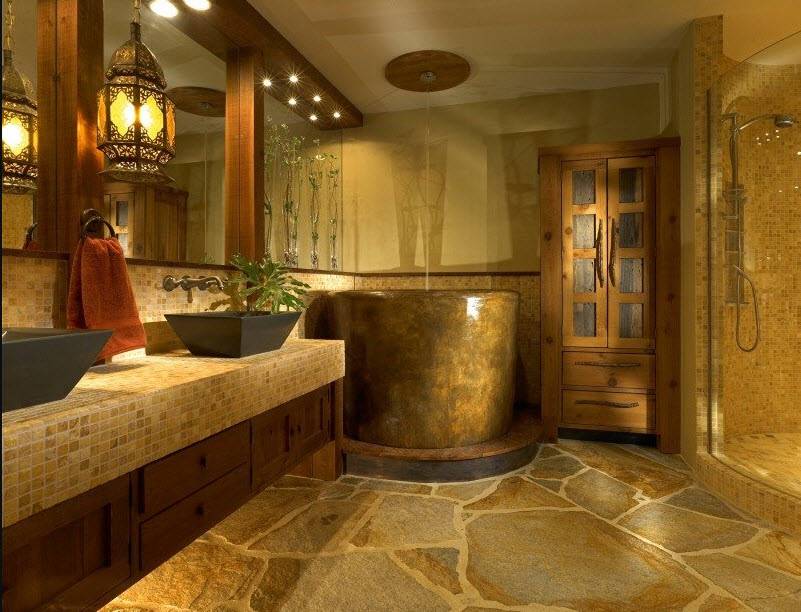 Изготовлен из натурального камня. В отделке ванной комнаты использован гранит, мрамор и базальт. Использование натурального камня для отделки не всегда возможно из-за слишком высокой стоимости материала. В ванных комнатах дизайнеры предлагают отделать стены и полы искусственным камнем, который по внешнему виду очень похож на натуральный камень.
