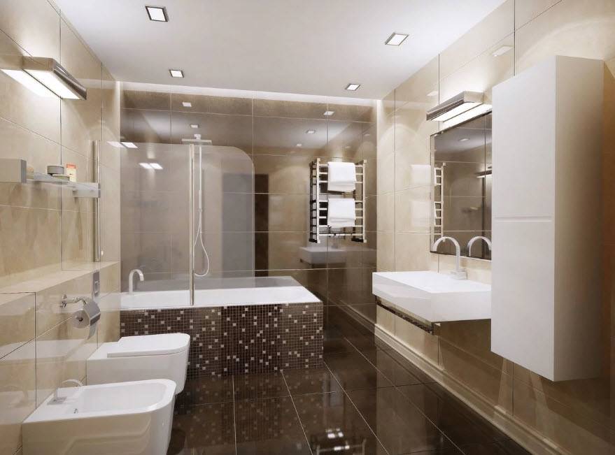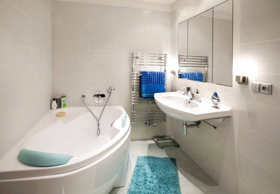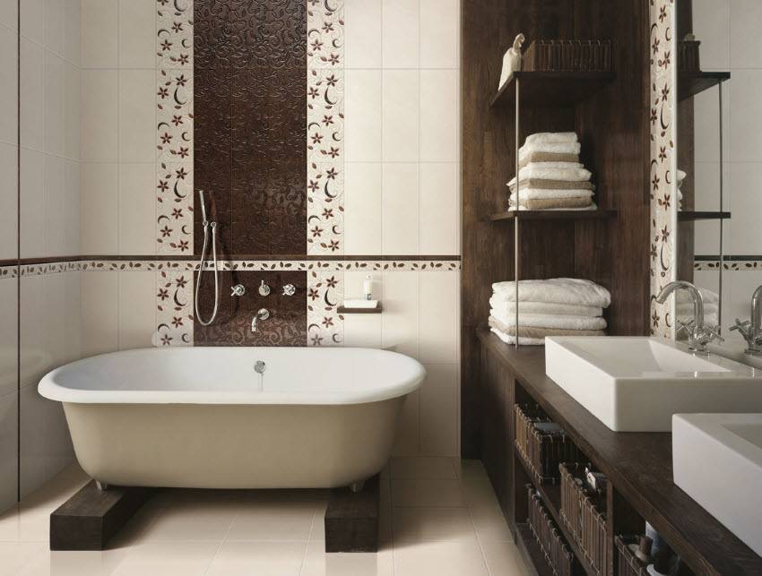 Маленькую ванну можно отделать светлой плиткой с обыгрыванием разной вариацией оттенков. Тогда комната будет выглядеть чуть просторнее, свежее и свободнее. На таком фоне отлично будут смотреться немногочисленные аксессуары или сдержанный декор. Теплые и холодные оттенки используют в равной степени одинаково. Но предпочтение к холодным наиболее всего из-за того, что они визуально делают комнату просторнее, воздушнее. Размер плитки приветствуется некрупный – до 300х300 мм, но и не мелкий – от 100х100 мм. Выпуклые рисунки лучше использовать в качестве декорирования и в небольшом количестве.