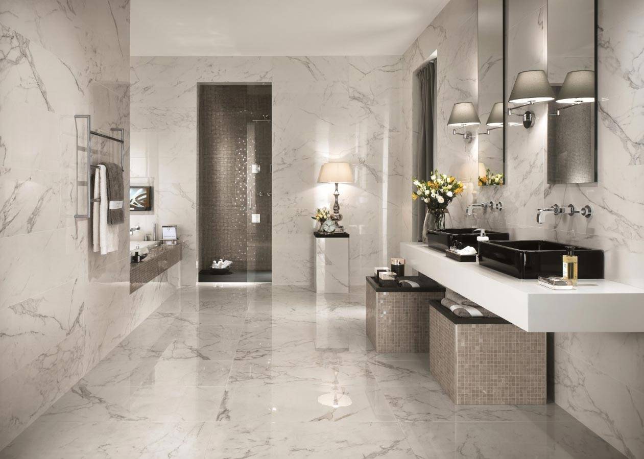 Без сомнения интерьер ванной с такой плиткой приобретет элегантность, ведь мрамор почитался с древних времен разными народами, его использовали только для оформления дворцов. Он великолепно смотрится на полу и стенах, его рисунок с многочисленными черными разводами действует успокаивающе и в то же время завораживает.
