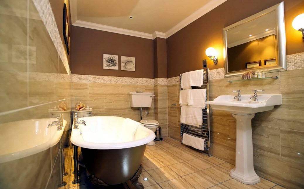 Стандартные плитки среднего формата прекрасно подходят для отделки стен и пола в комнате с ванной любого размера.