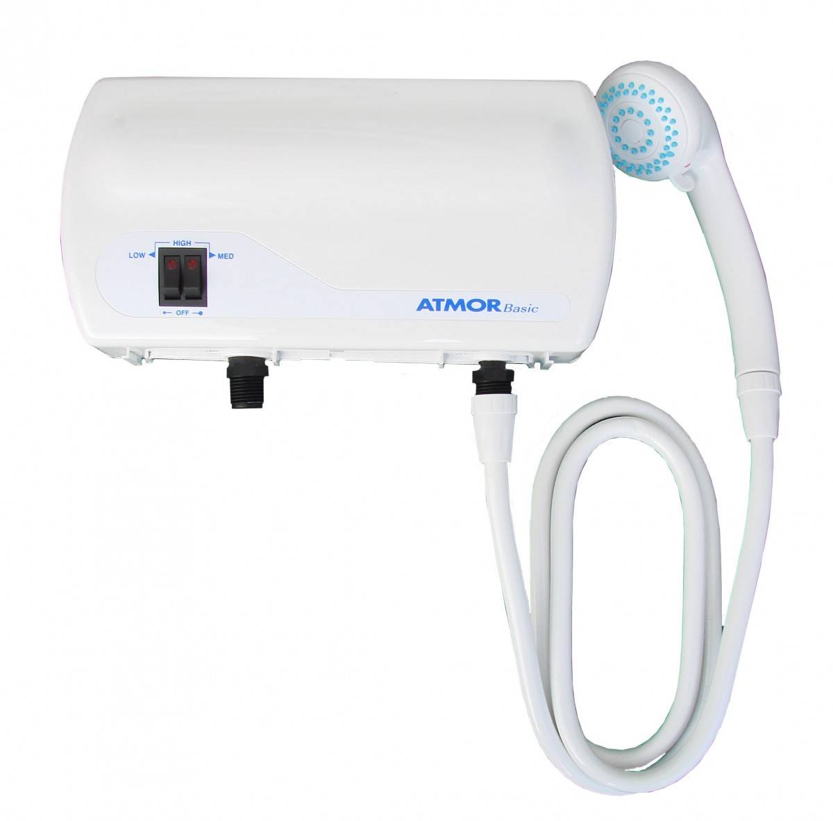 Если напор в системе меньше допустимого, электричество отключается, индикатор гаснет. Нагреватели Atmor можно использовать в многоквартирных домах старой постройки. Как пример можно предложить к рассмотрению модель электрического проточного водонагревателя Atmor ENJOY 100 5000 Душ. Производительность его 3 л/мин, при нагреве до 650 С, мощности подключения в 5 кВт. Как напорный вариант для этих параметров предлагается модель Atmor In-Line 5.