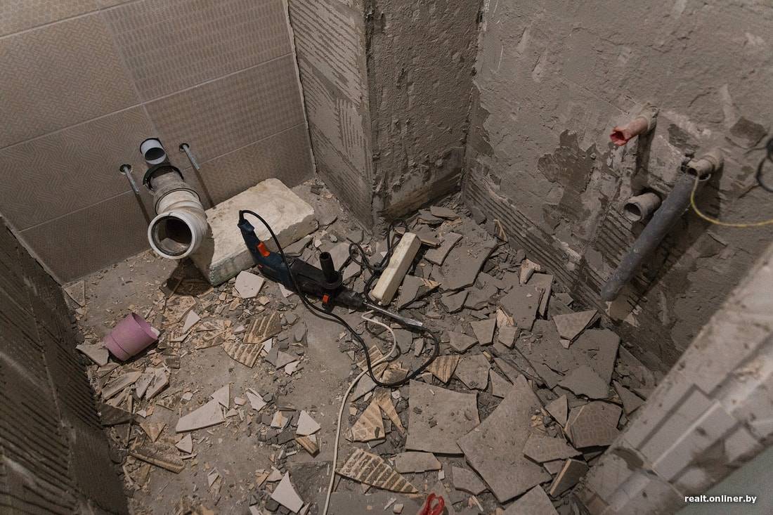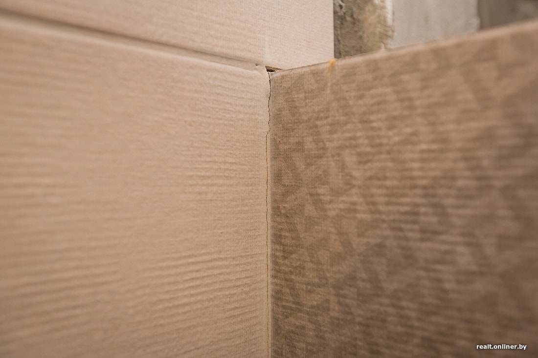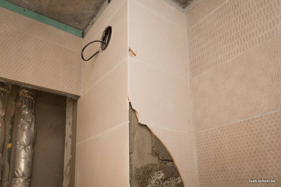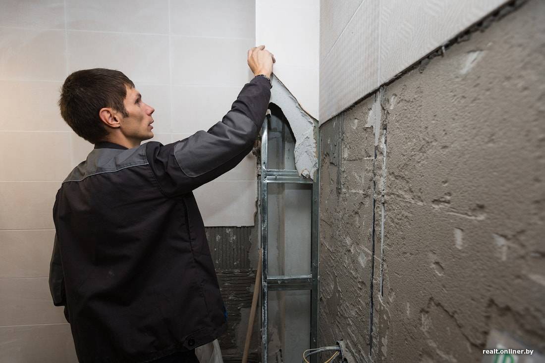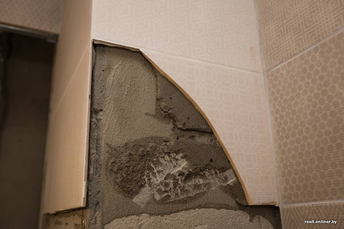 Чуть позже, когда новые работники, нанятые Андреем, начали сбивать облицовку, выяснилось, что плитки довольно большого размера лежали на «плюшках» — промазать клеем всю поверхность мастер забыл.