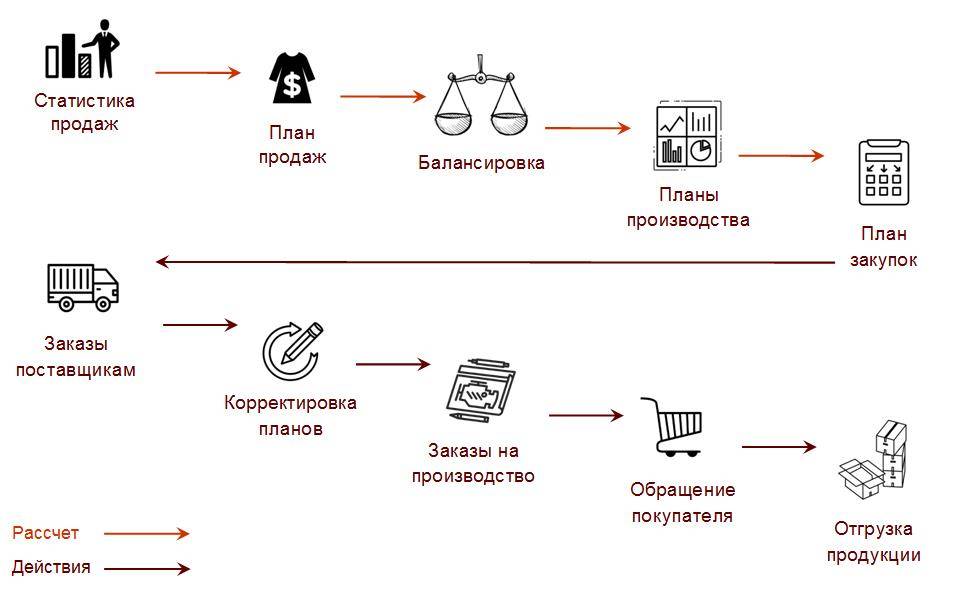 Одна из основных задач планирования на уровне предприятия — согласовать деятельность разных отделов компании — продаж, закупок и производства. Какие проблемы могут возникать, если заранее этого не делать? Рассмотрим пример. Пусть в этом месяце ожидается спрос в размере около 140 000 единиц продукции, в следующем месяце ещё около 90 000. Мощности компании позволяют производить только 50 000 — 60 000 изделий в месяц. На складе около 50 000 изделий. Что делать, чтобы обеспечить продажи? Можно ввести третью смену или отдать часть производства на аутсорсинг. Но скорее всего, даже в этом случае производство не справится. Особенно обидно, если производство не было в предыдущие месяцы загружено на полную мощность. Компания могла подготовиться к повышенному спросу, произведя запас продукции.