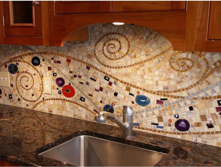 Кухонный фартук, выложенный мозаикой из плиточек разных оттенков