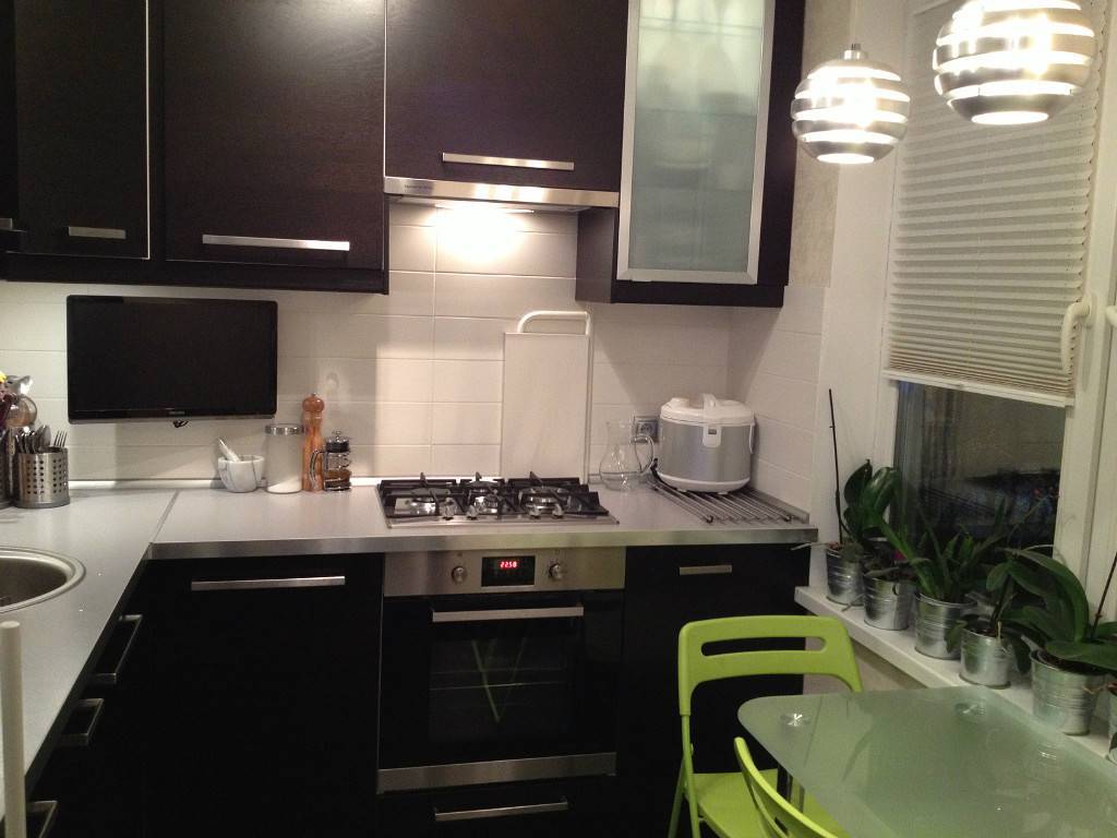Хотелось бы остановиться и на такой эконом-схеме для кухни, как установка гарнитура к стене, целиком и заранее отделанной пластиковыми панелями — дешевым и популярным способом декора стен. Пластиковые панели, как и любые материалы панельного типа, не требуют чистовой отделки стены за ними, они гибкие, а значит, подходят к самой кривой стене — и, наконец, они дешевле и доступней, чем любой другой упомянутый материал. Однако эти панели нетермостойки и очень быстро загрязняются. Кроме того, крепление кухонных шкафов к стене будет сильно затруднено, как и установка плинтусов — панели крепятся на некотором расстоянии от стены.