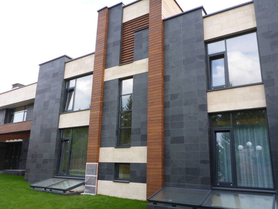 - Керамогранит — иначе называется «искусственный камень». Применяется для возведения вентилируемых фасадов, обустраиваемых на основе прочного каркаса. Реже такие полотна монтируются на специальный клей.