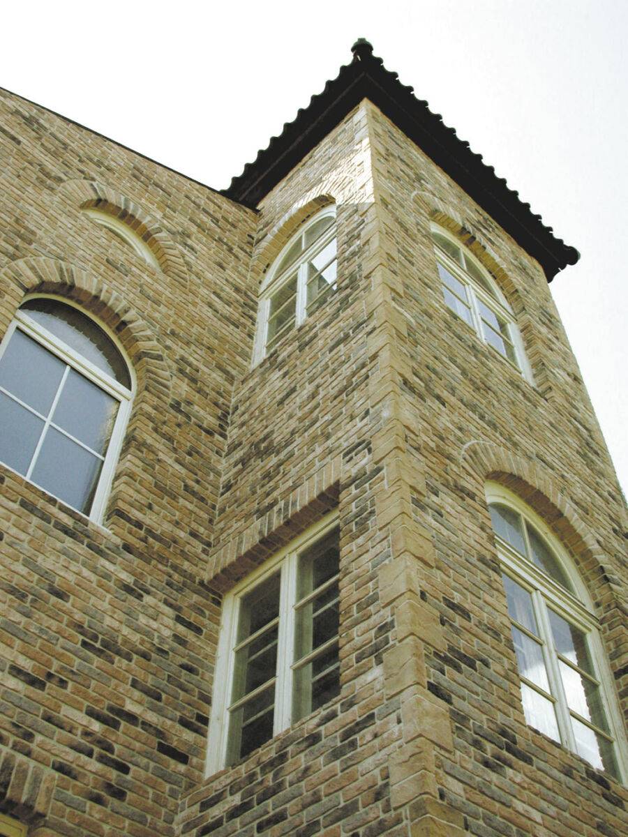 Сложные формы фасада относительно геометрии отделываются частями. Это могут быть острые углы, кривые выступы и впадины, колонны. Плитку дополнительно прижимают широкой малярной лентой. Достаточно выдержать примерно 5-10 минут, после чего скотч снимается, укладка продолжается. Время зависит от используемого клея, как быстро он застывает после нанесения на основание.