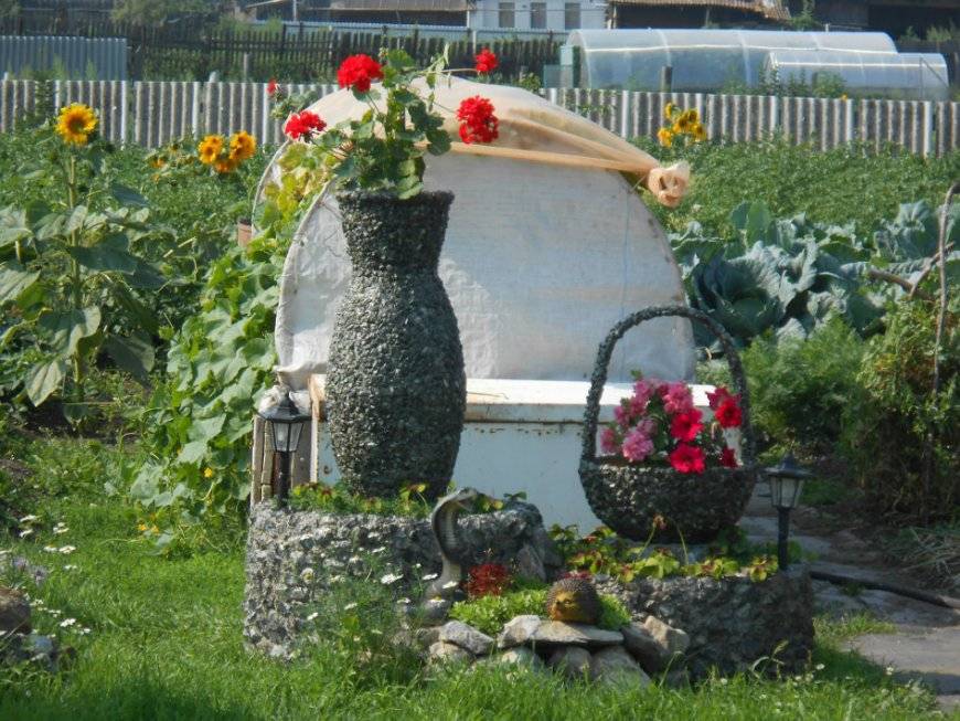 - пенопластом, старыми вёдрами, ваннами, металлическими бочками для облегчения веса фигуры и уменьшения объёма используемого бетона;