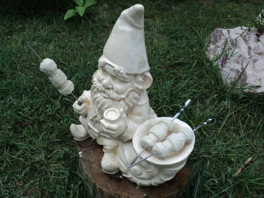 Когда форма найдена, делаем садовые фигуры из гипса своими руками. Замешиваем раствор из гипсового порошка. Перед заливкой поверхность формы смазать маслом. Засыхает он на протяжении полу часа, далее можно вынимать изделие и начинать шлифовать.