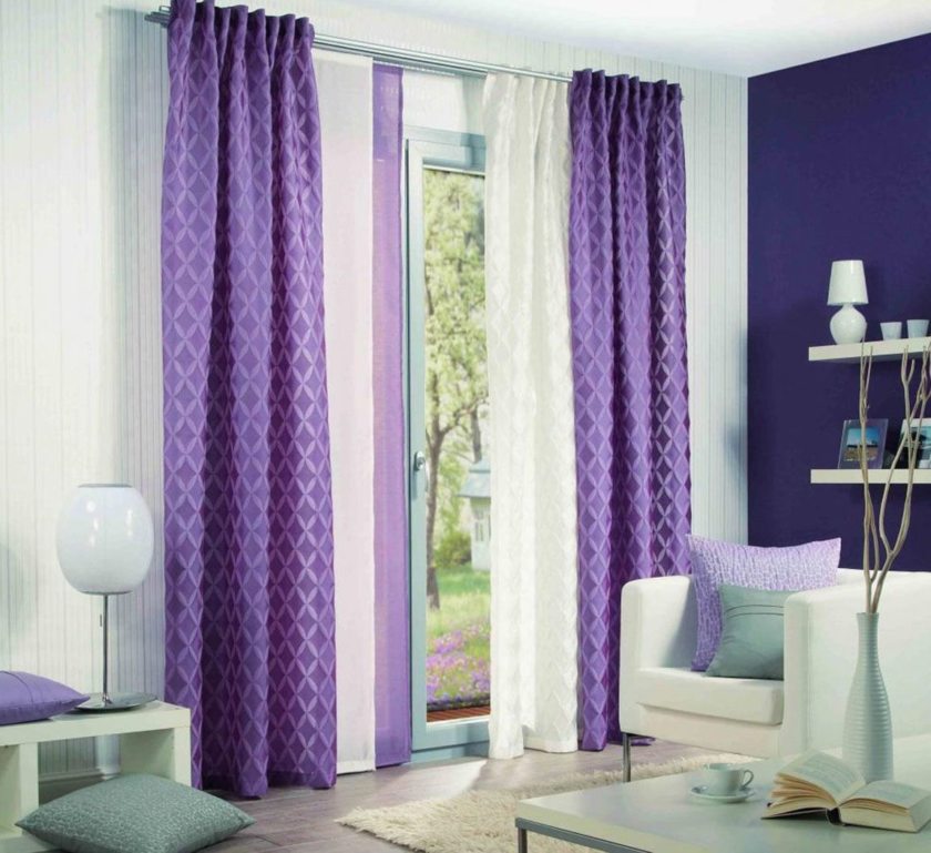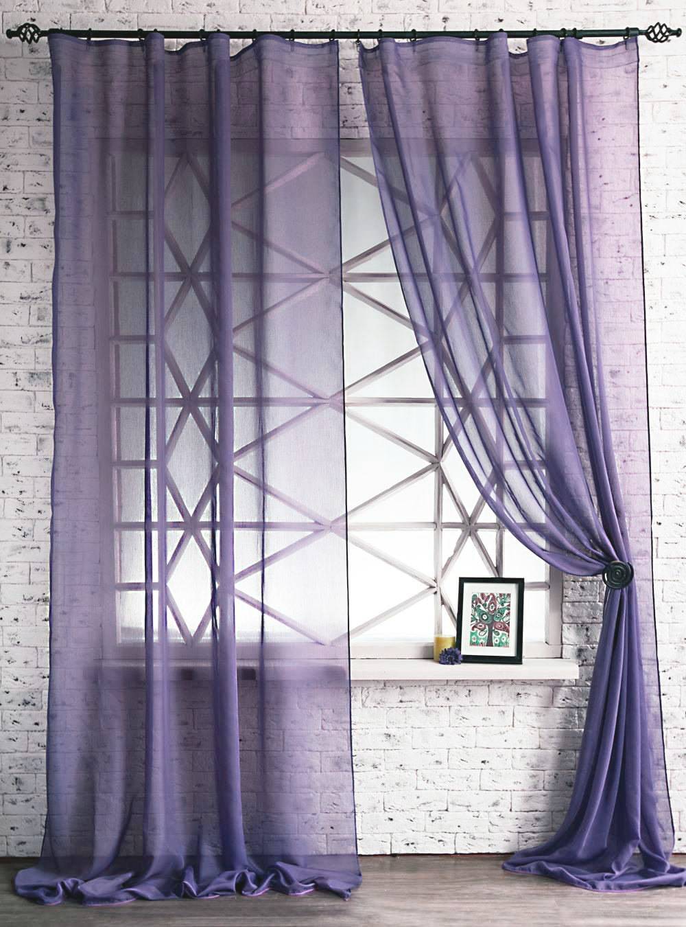На фото комбинация из портьер и тюля. В интерьере представлен фиолетовый цвет в нескольких оттенках.