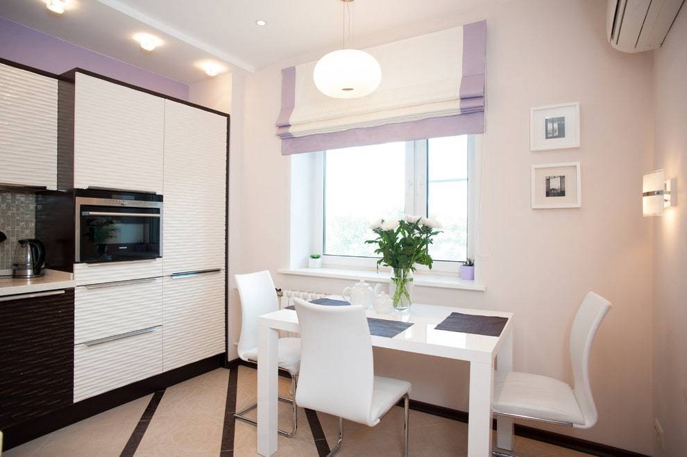 Гармоничное сочетание нежного фиолетового рисунка на римской шторе с фасадами кухонного гарнитура