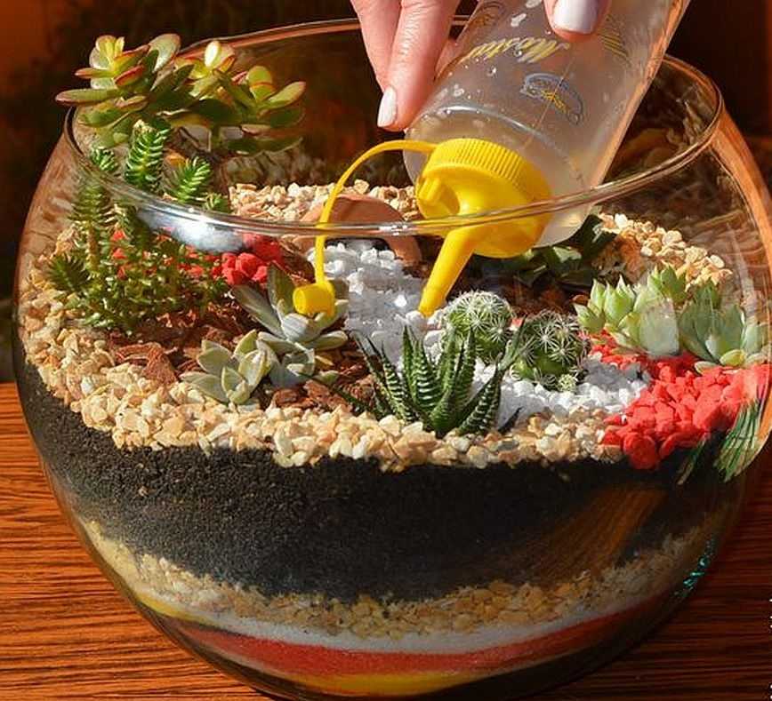 При помощи пластиковой бутылочки, закрытой крышкой с длинной трубочкой поливать мини-садик несложно