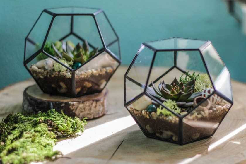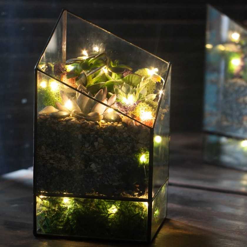 Флорариумы бывают самых невероятных геометрических форм и размеров, очень популярны мини флорариумы, а также невероятная замкнутая система — закрытый флорариум, вовсе не требующий вмешательства человека.