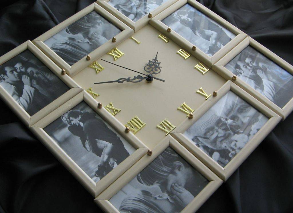 Оригинальности в комнату добавит композиционный коллаж «Часы». Где рамки со снимками размещены по циферблату в произвольной последовательности, либо в соответствии с возрастной категорией членов семьи.