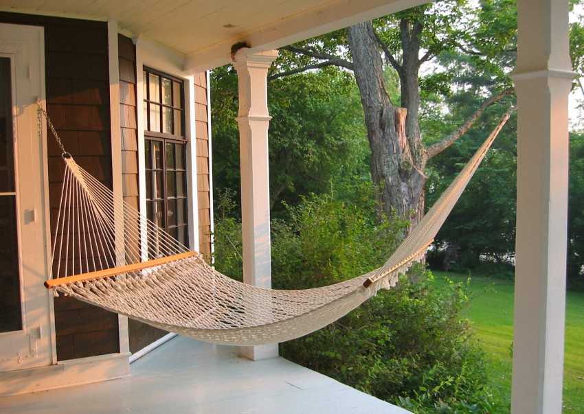 Гамак можно также разместить на веранде. Он прикрепляется к деревьям с помощью веревки или же универсального комплекта, который специально предназначен для подвешивания к деревьям. Подобное ложе можно подвешивать не только к деревьям, его можно вешать на веранде, на крючки в потолке, между столбами и т.д. Вне зависимости от модели каждый гамак оснащен специальными кольцами, через которые и продеваются веревки и обматываются вокруг стволов деревьев.