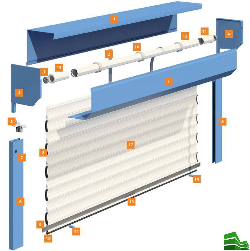 Элементы сборки ворот-рольставней: 1 — защитный короб. 2 — тяговая пружина, 3 — подшипник, 4 — боковая крышка, 5 — направляющее устройство, 6 — направляющая шина, 7 — заглушка, 8 — боковой замок, 9 — запорная полоса, 10 — концевой профиль, 11 — универсальная капсула, 12 — октогональный вал, 13 — ригельный замок, 14 — стопор, 15 — подшипниковая капсула, 16 — дистанционное кольцо, 17 — роллетный профиль
