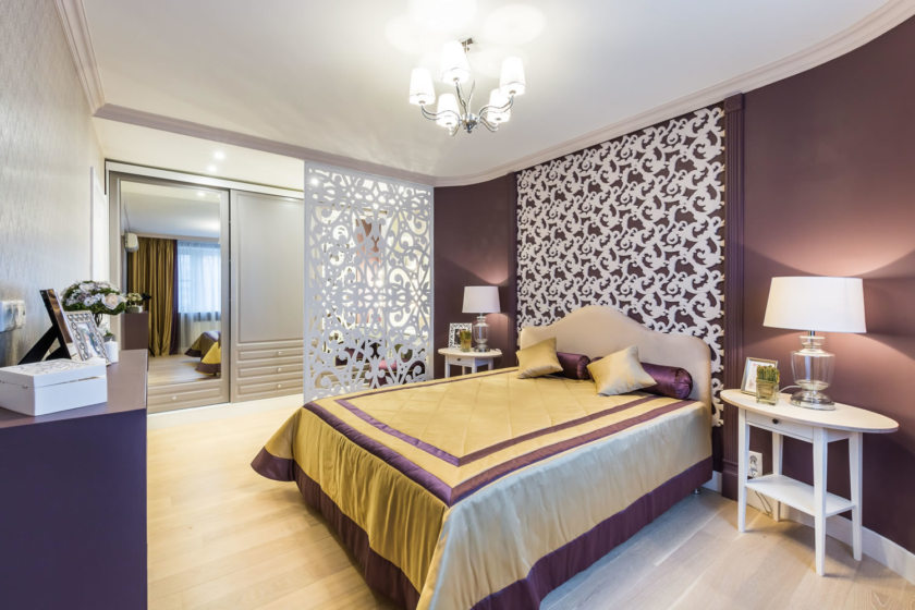 Для отделки гардеробной в спальне чаще используют те же материалы, что для стен и пола. Выбор дизайна зависит от предпочтений владельцев. Если из спальни есть выход в ванную, гардеробную лучше отделять специальной водонепроницаемой ширмой.