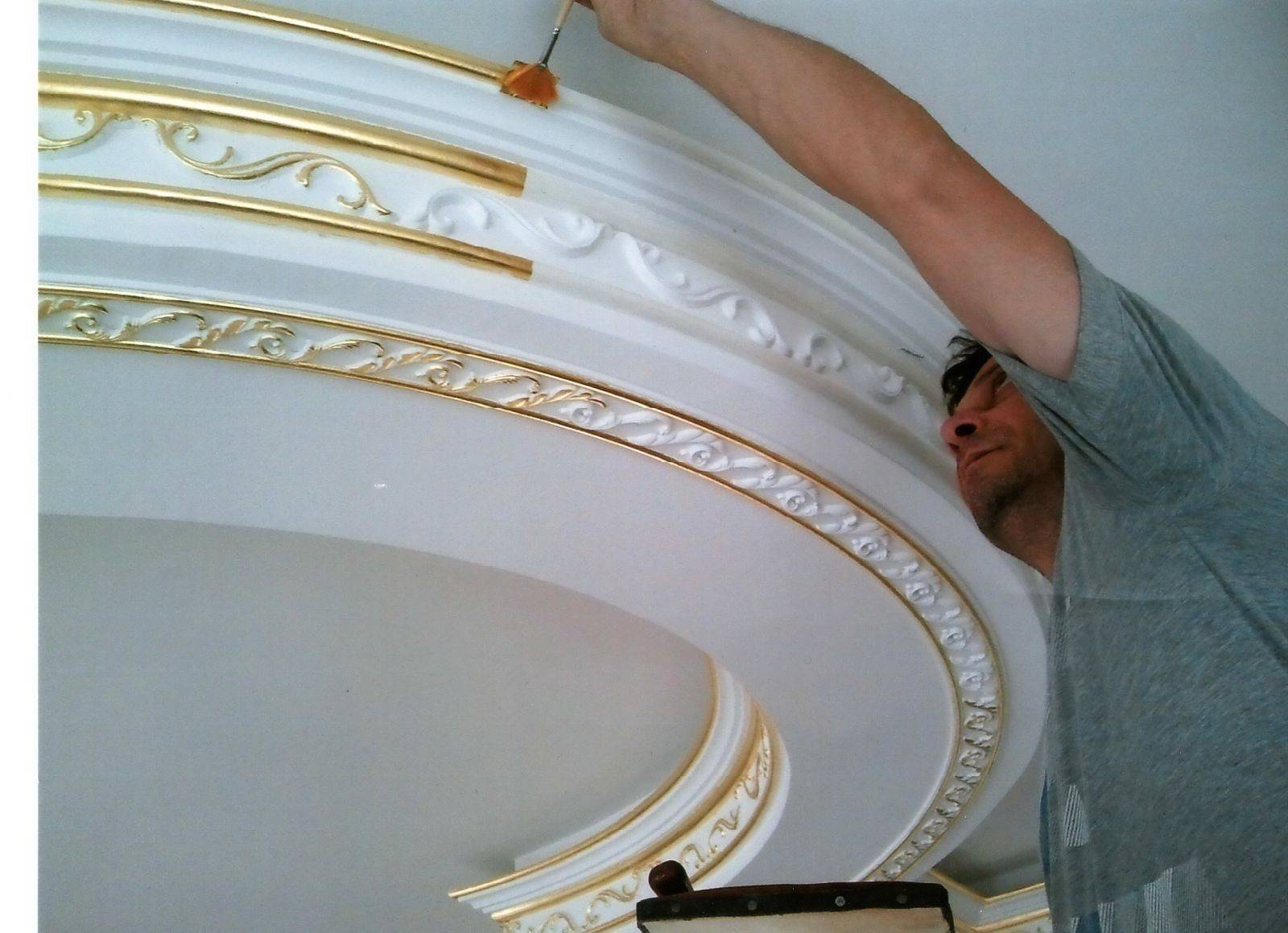 - Перед началом монтажа галтели, крепящейся на клей, стену тщательно очищают от пыли. Это позволяет избежать появления не проклеенных участков;