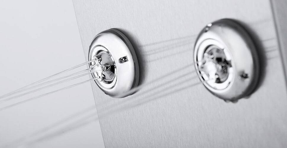 Наличие системы гидромассажа — вот что делает обычную кабину гидробоксом. Это набор форсунок, которые сильным потоком воды массируют руки, ноги, шею и поясницу. В бюджетных моделях устанавливают два вертикальных ряда по 3-4 форсунки в каждом. В боксах подороже количество форсунок доходит до 40 шт. Их размещают на задней и боковых стенках