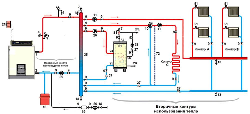 В сложных разветвленных отопительных системах даже насосы завышенной мощности не смогут соответствовать разным параметрам и условиям работы системы. Это негативно скажется на функционировании котла и сроке службы дорогостоящего оборудования. Помимо этого, каждый из подключенных контуров имеет свой собственный напор и производительность. Это приводит к тому, что одновременно слаженно вся система работать не может.