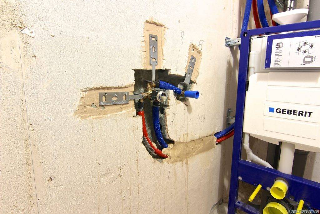 - Затем намечают места для крепления кронштейна и штробят подвод к холодной и горячей вод для установки смесителя;