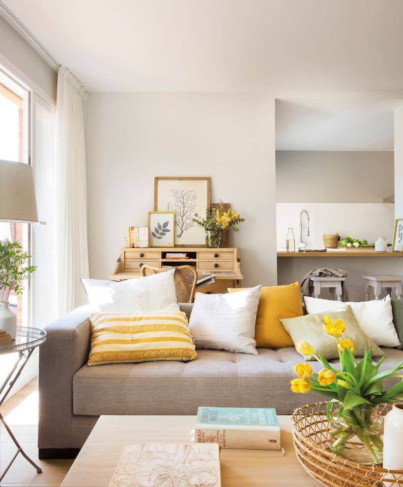 Яркие подушки на диване могут быть темнее основного оттенка интерьера.