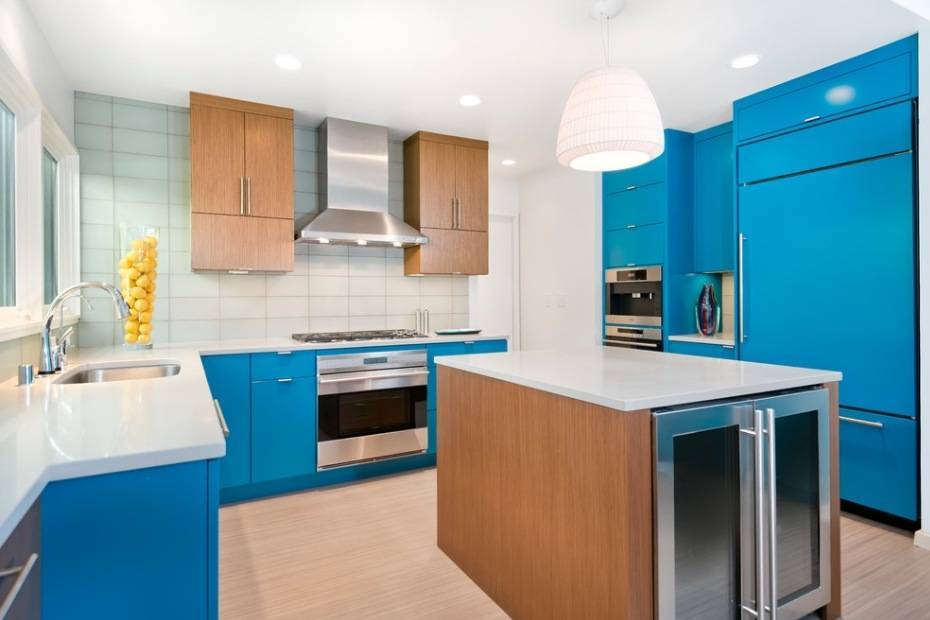 Вертикальные поверхности в кухне голубого цвета могут быть двух видов: