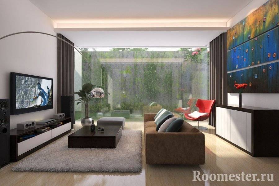 визуальные приемы – различная отделка потолка, стен, разная группировка мебели, например, с помощью стеллажа и телевизора.
