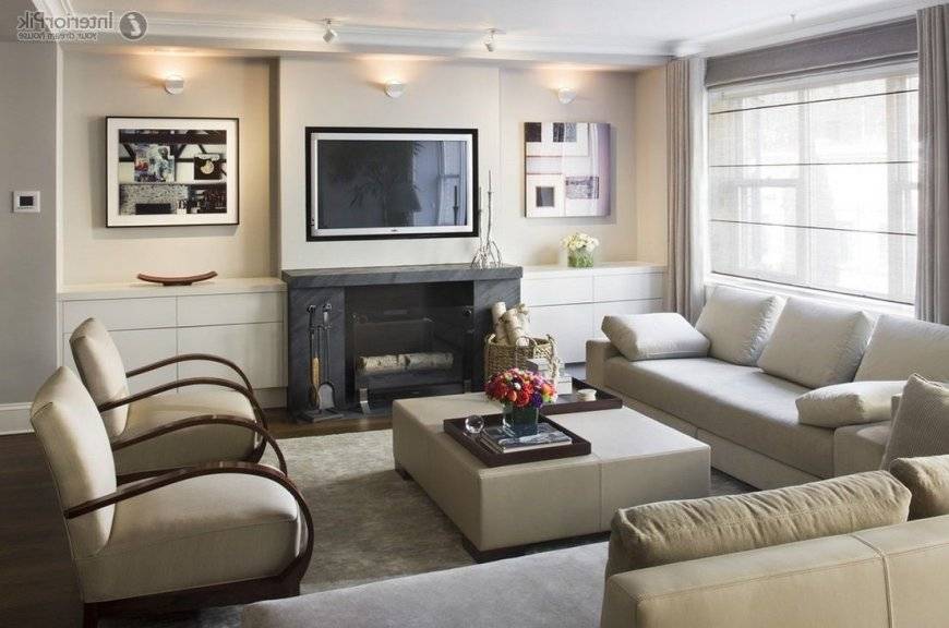 Чтобы гостиная с камином производила самое благоприятное впечатление своей дружелюбной атмосферой, обязательно продумайте уголок для отдыха и общения. Поставьте рядышком с порталом два кресла и кофейный столик, а книжный шкаф и торшер попытайтесь расположить на расстоянии вытянутой руки. И ни в коем случае не вешайте над ним телевизор, это прямой конкурент камина, мешающий наслаждаться бесконечной и завораживающей игрой пламени.