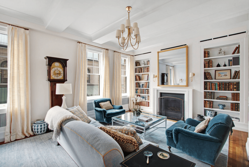 На каминных полках из мрамора или дерева, которые являются неотъемлемым атрибутом, устанавливаются подсвечники, часы, статуэтки, фото в рамках.