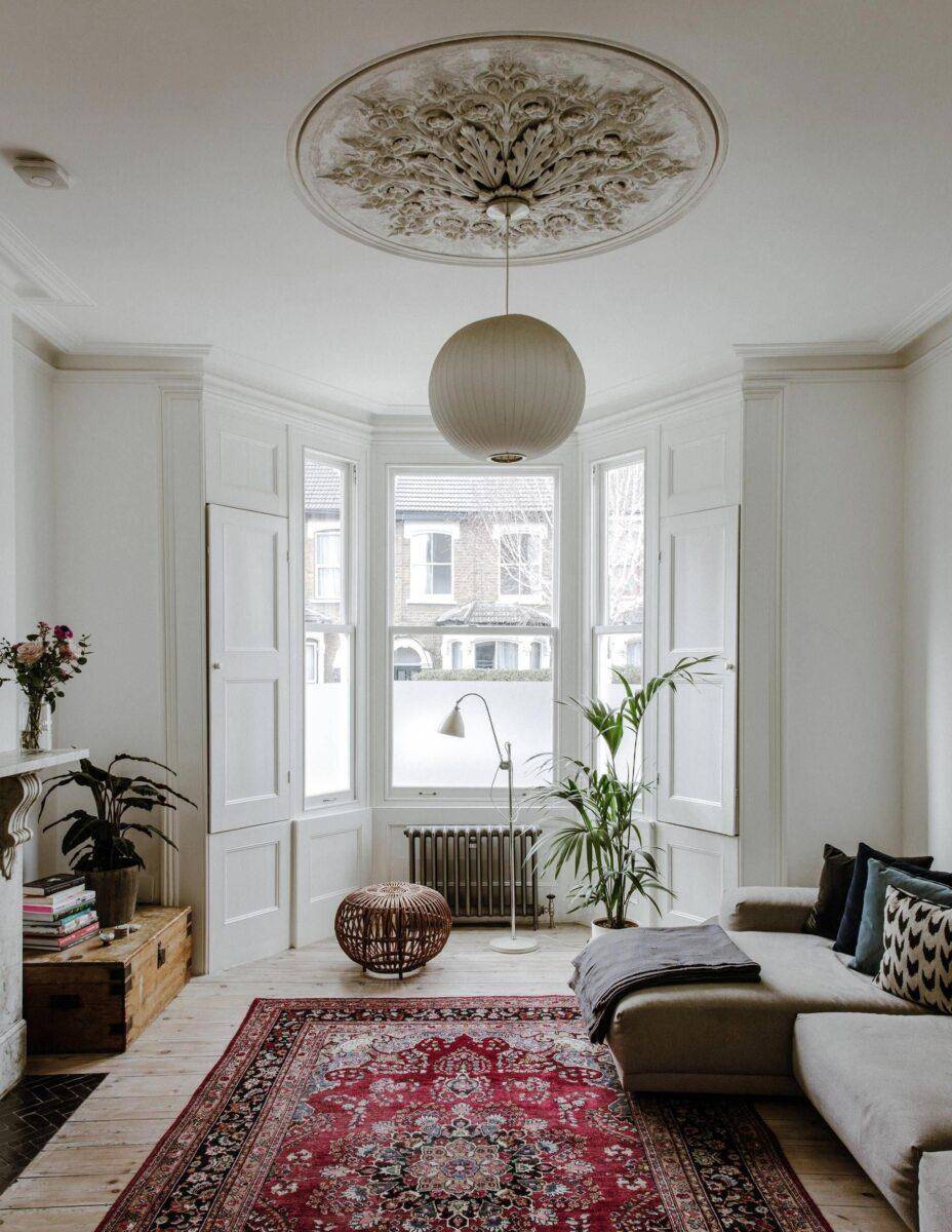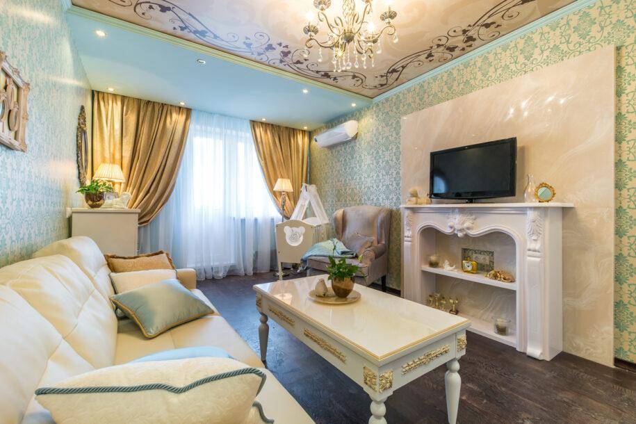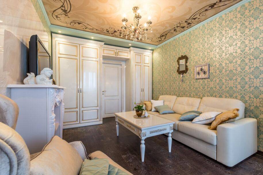 Важную роль играет правильное оформление потолка, который с успехом способен своей роскошью подчеркнуть классику интерьера гостиной. Потолок занимает значительную часть комнаты, его невозможно скрыть, поэтому он всегда находится на виду. Для соблюдения стиля его можно украсить карнизами, лепниной, росписью и розетками для люстр. Создавая украшение потолка, необходимо строгое соблюдение геометрически правильных форм и симметрии.