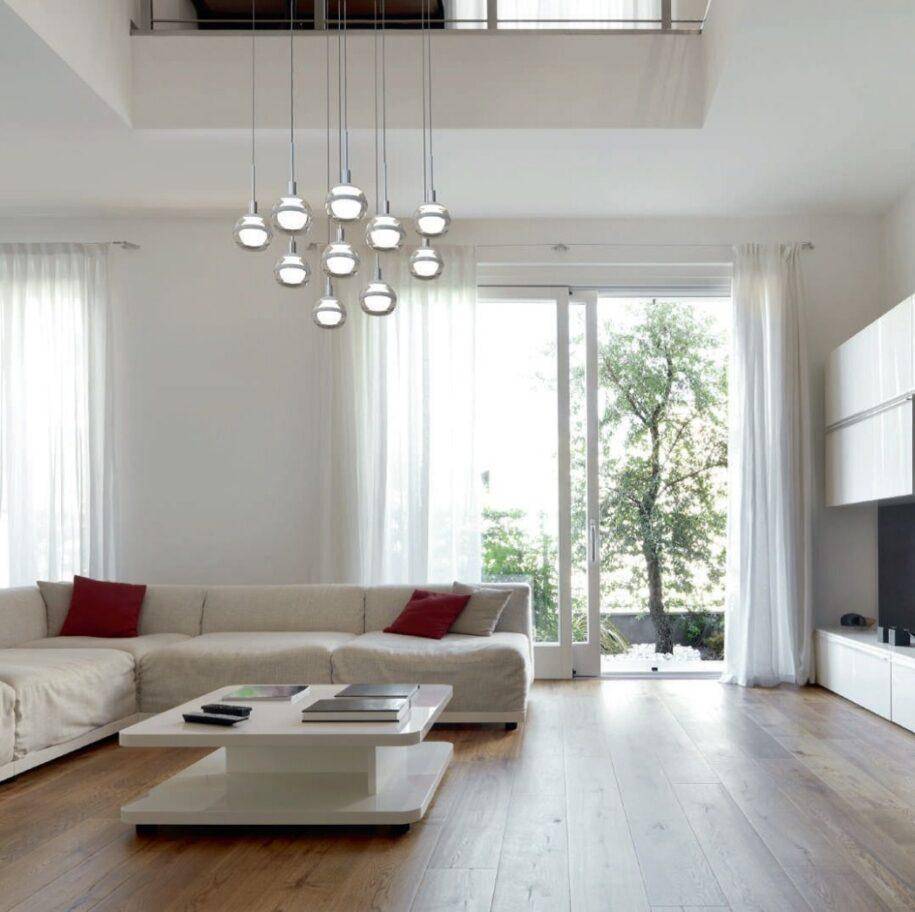 Достаточно часто люстру украшают хрустальными подвесками. Благодаря этому удается подчеркнуть роскошь интерьера. Однако люстру не допускается крепить вплотную к потолку. Ножка должна составлять не более 70 см. Это позволит правильно наполнить пространство и сделать его более сбалансированным.