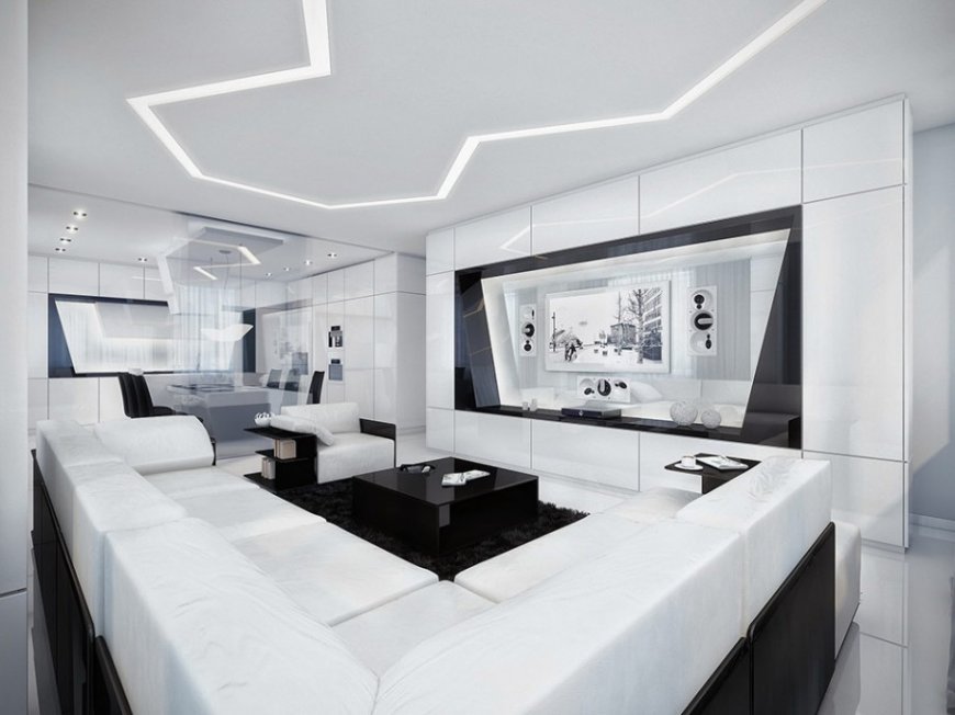 Цветовая гамма – монохромность: черный, белый, серебристый, песочный оттенки. Разрешается дополнение яркими экстравагантными деталями – мебелью или предметом изобразительного искусства.