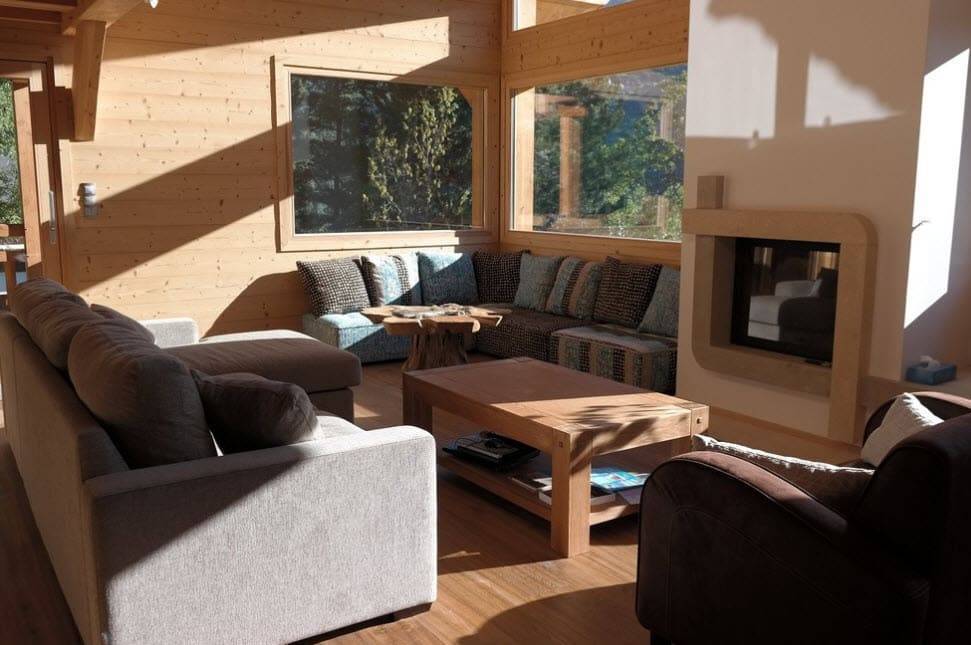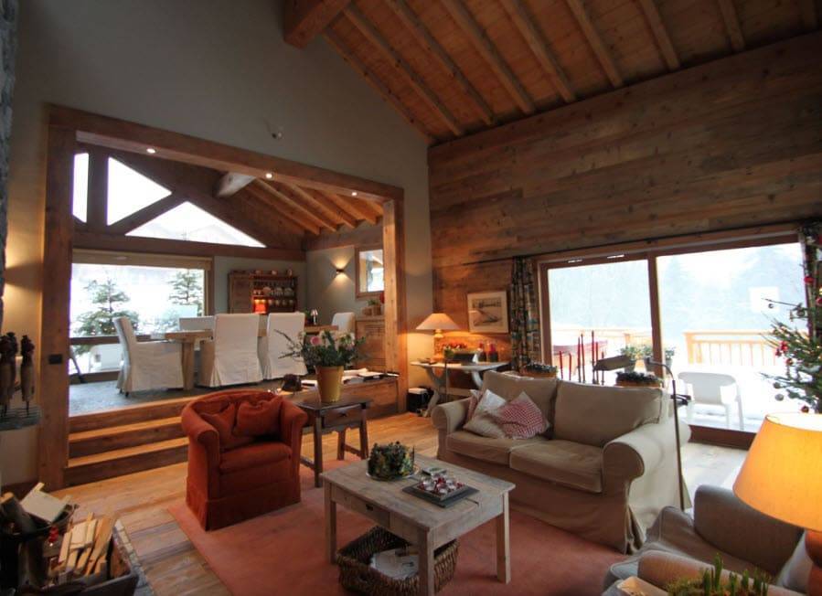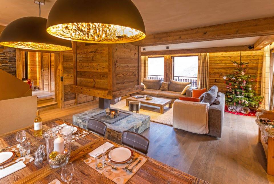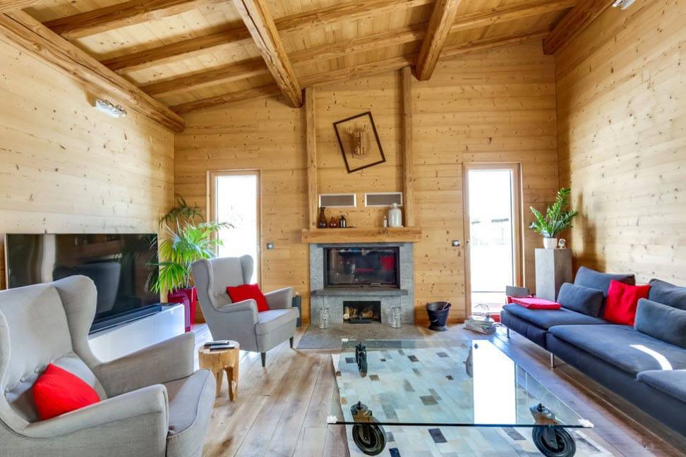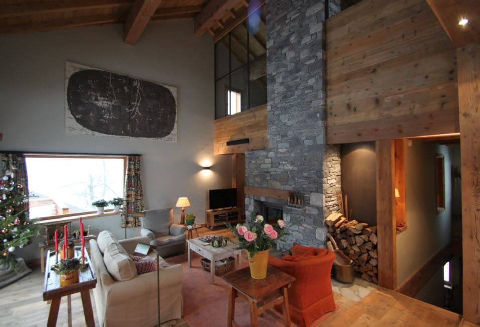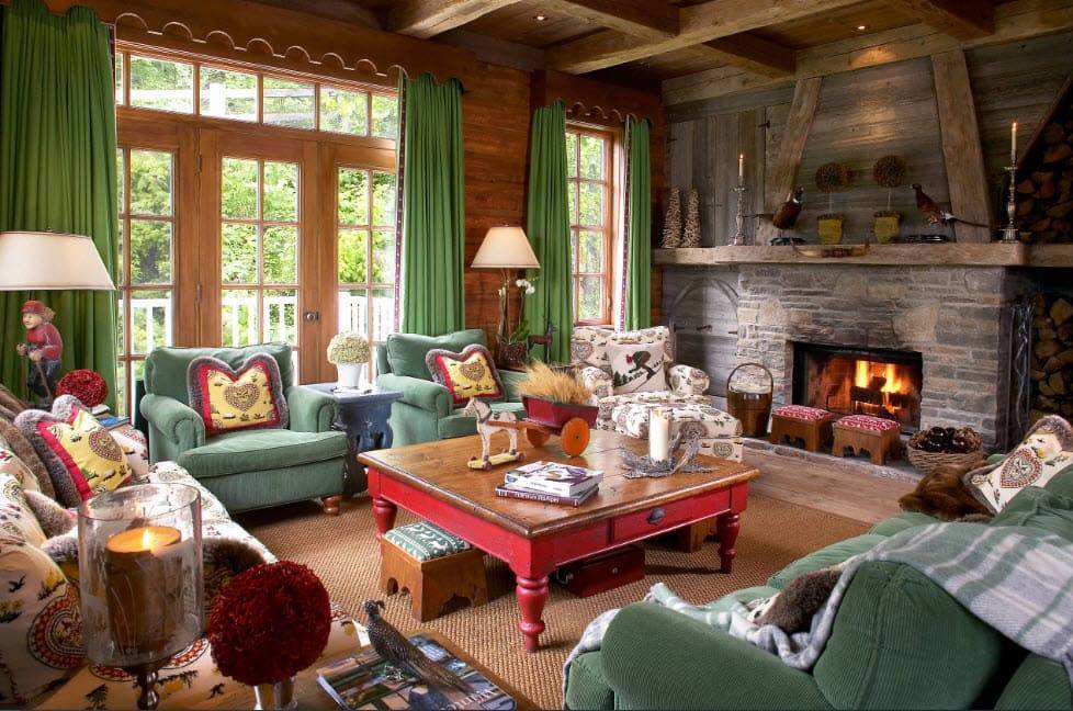 Гостиные шале создают теплую атмосферу домашнего огня. Доминирующие цвета — красный и зеленый. Стены из балок, деревянные полы и потолки, скрипучие лестницы и массивные, часто резные поручни — это основа горных интерьеров. Сердцем дома является, конечно же, камин — кирпичный, а чаще всего чугунный. Свечение огня дополнительно согревает интерьер и заставляет дом быть более уютным и безопасным.