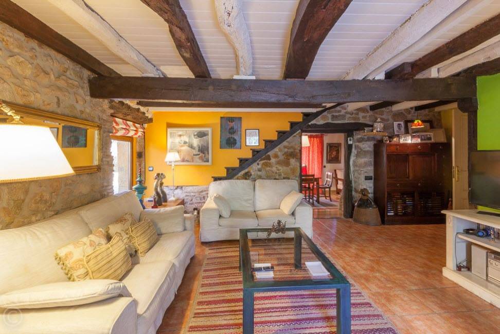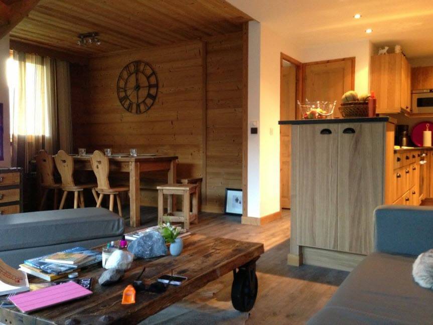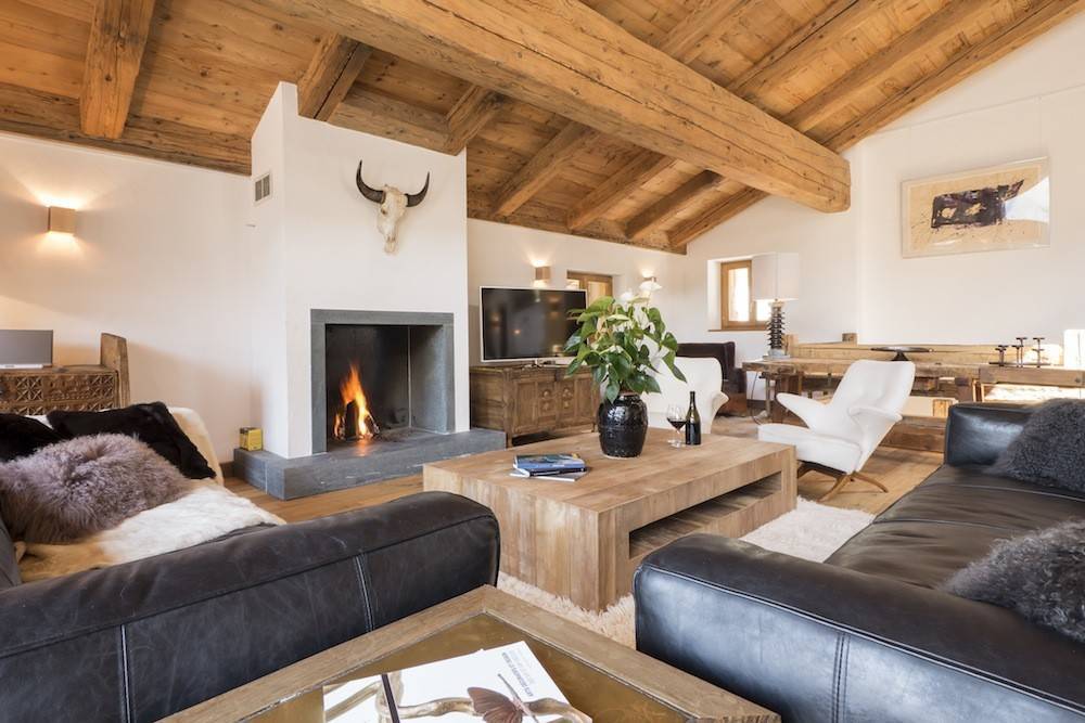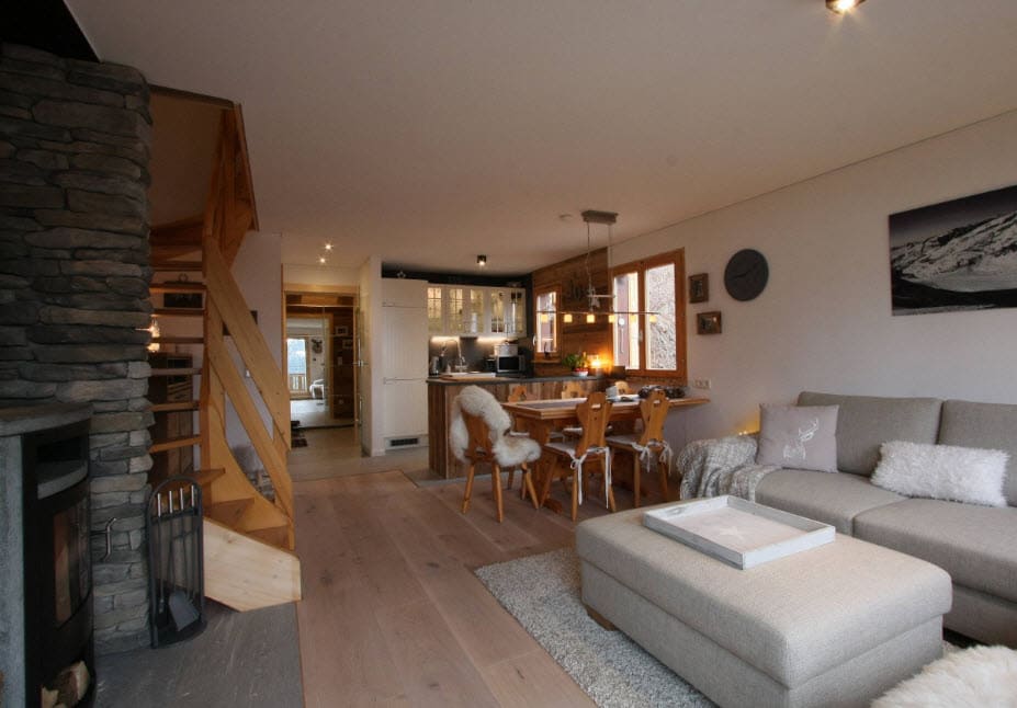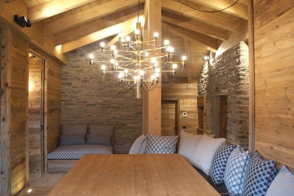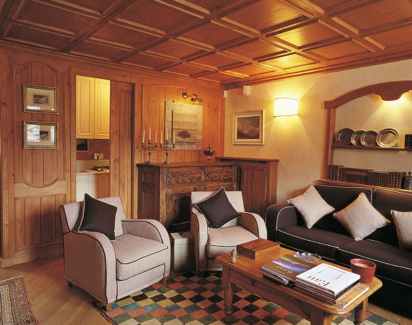 Гостиные шале создают теплую атмосферу домашнего огня. Доминирующие цвета — красный и зеленый. Стены из балок, деревянные полы и потолки, скрипучие лестницы и массивные, часто резные поручни — это основа горных интерьеров. Сердцем дома является, конечно же, камин — кирпичный, а чаще всего чугунный. Свечение огня дополнительно согревает интерьер и заставляет дом быть более уютным и безопасным.