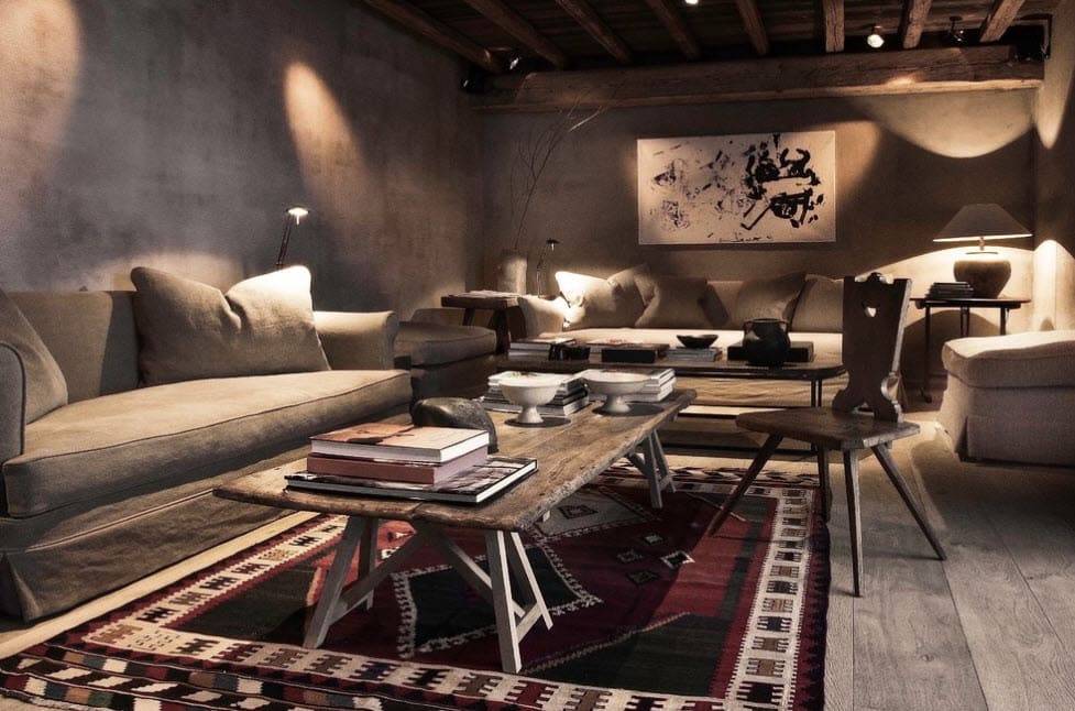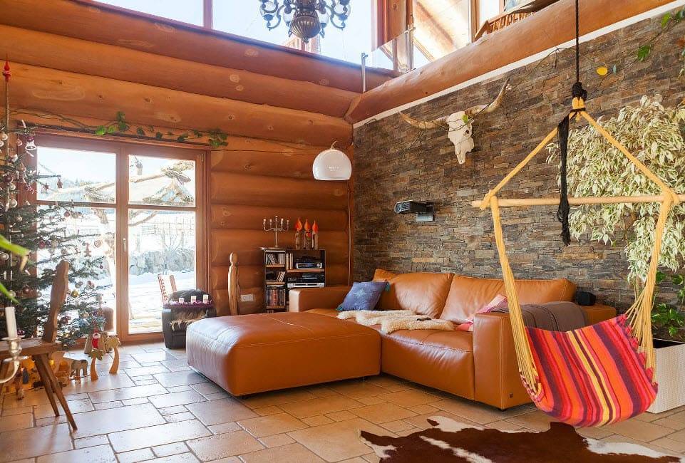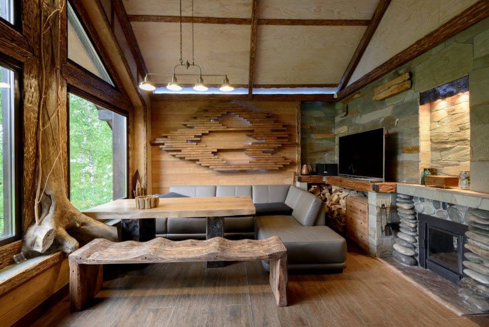Гостиная в стиле шале — дерево и изделия ручной работы
