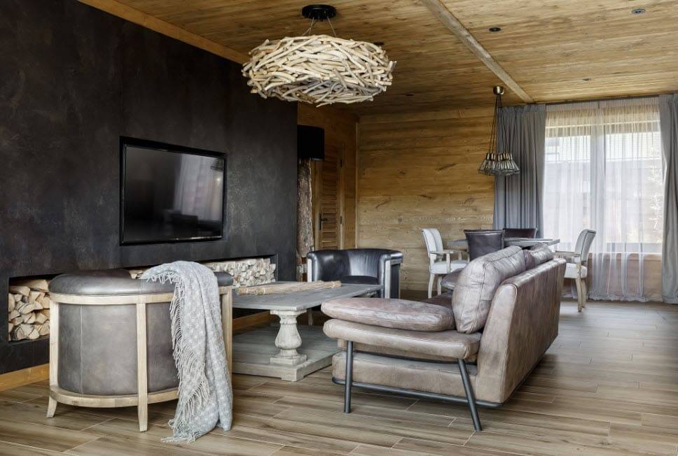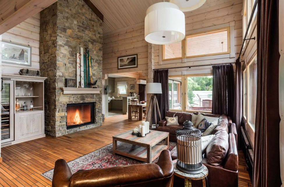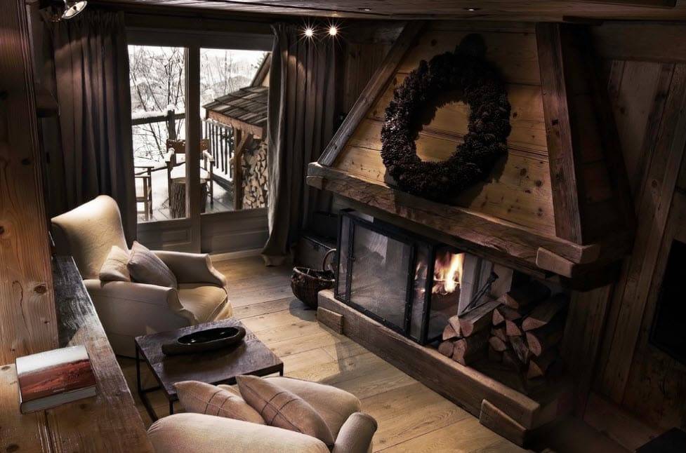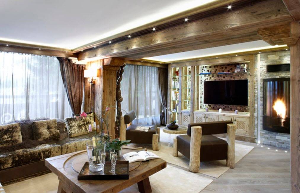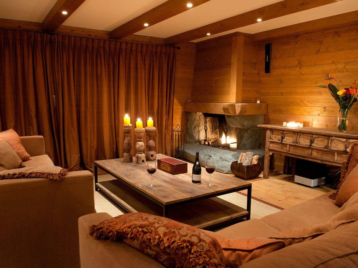 Гостиная в стиле шале с камином: тонкости отделки