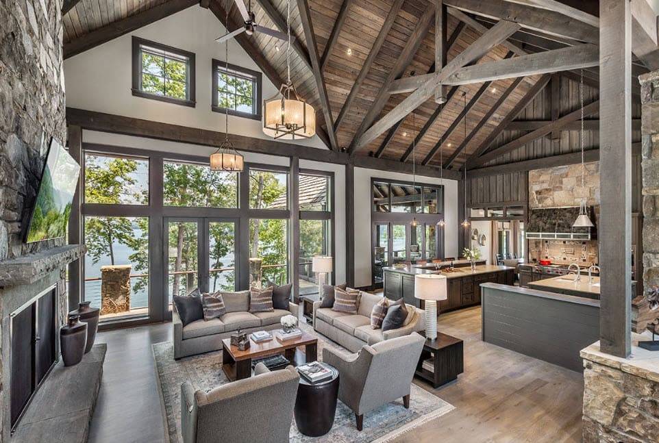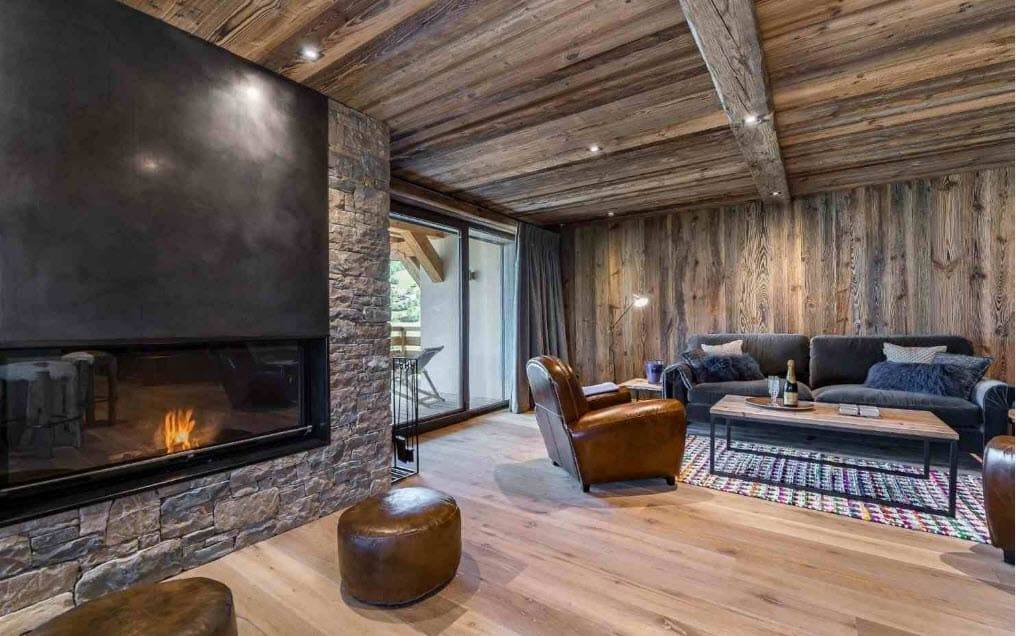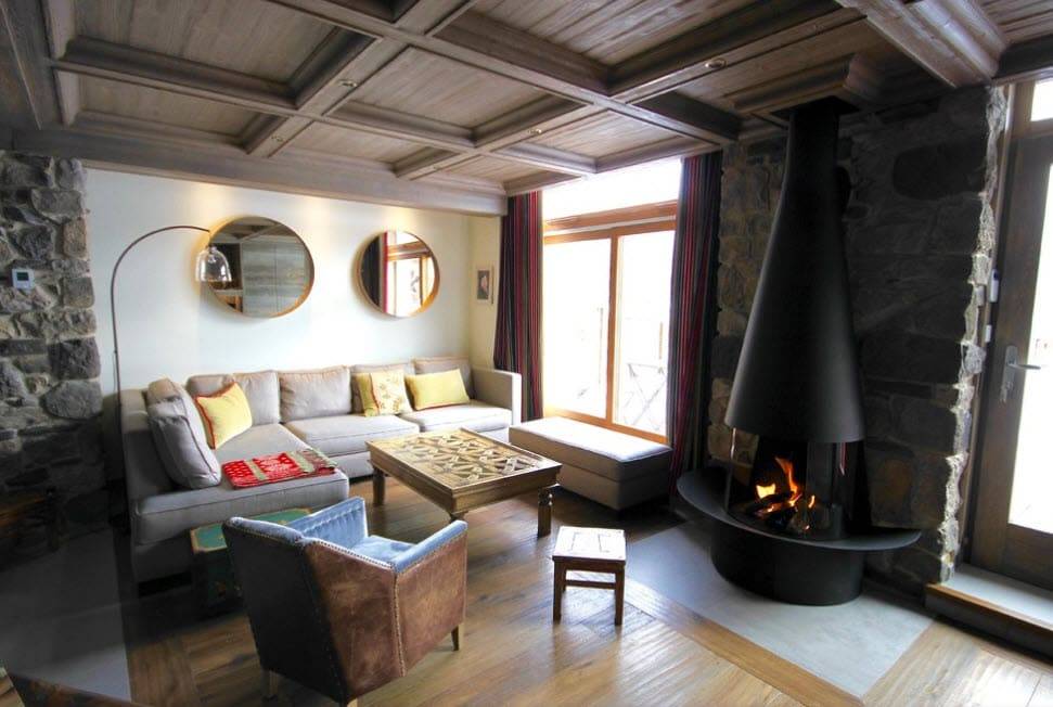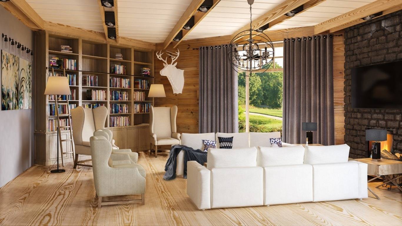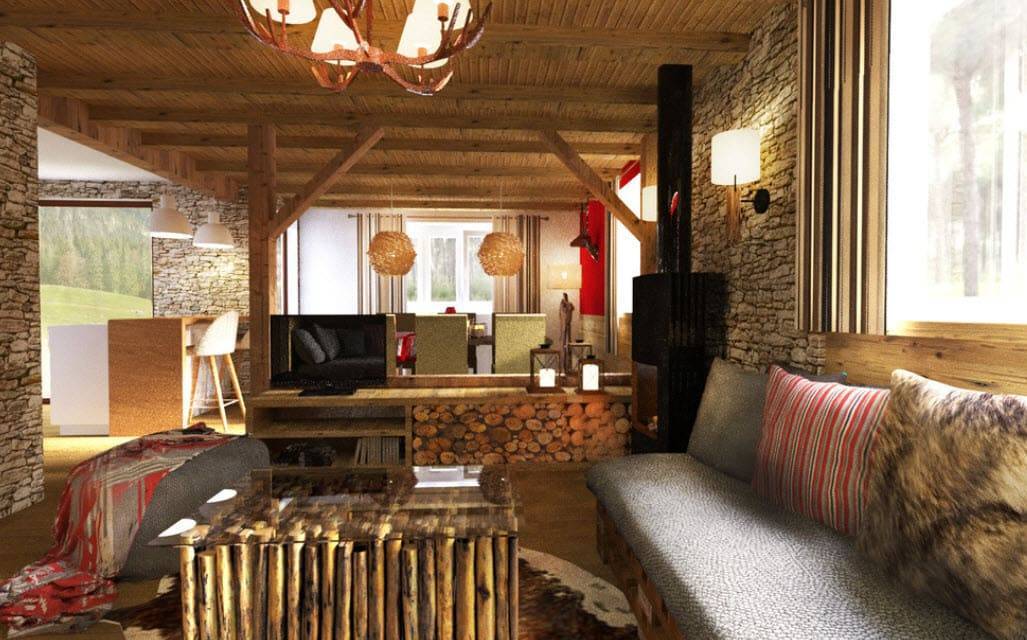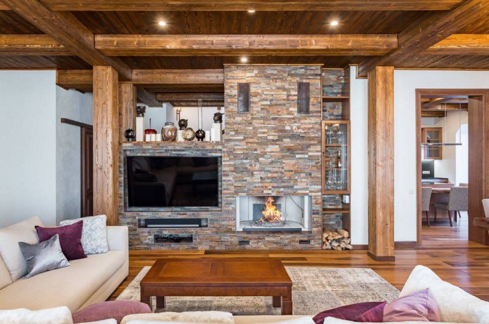 Гостиная в стиле шале с камином: тонкости отделки