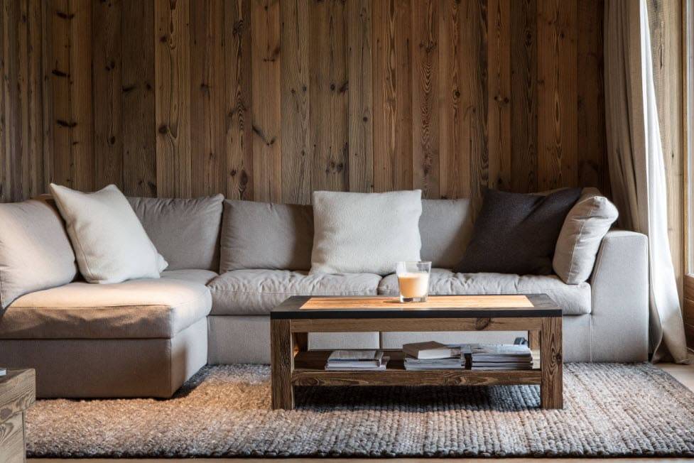 Классическая отделка стен в стиле шале выполняются из натурального дерева. Это могут быть деревянные панели или брус с минимальной отделкой.