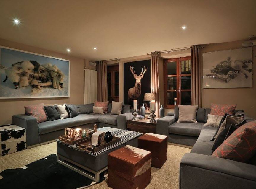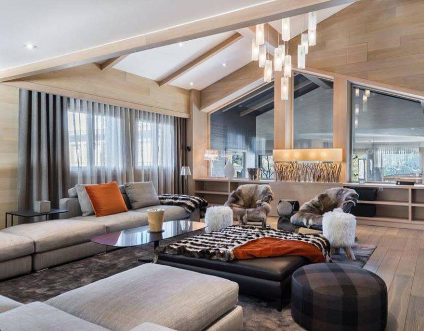 Дизайн гостиной в стиле шале подойдет для просторных комнат. Высокие потолки и панорамные окна – важные атрибуты комнаты. К украшениям гостиной можно отнести большие теплые ковры и шкуры животных. Для освещения следует выбрать аутентичные люстры больших размеров.