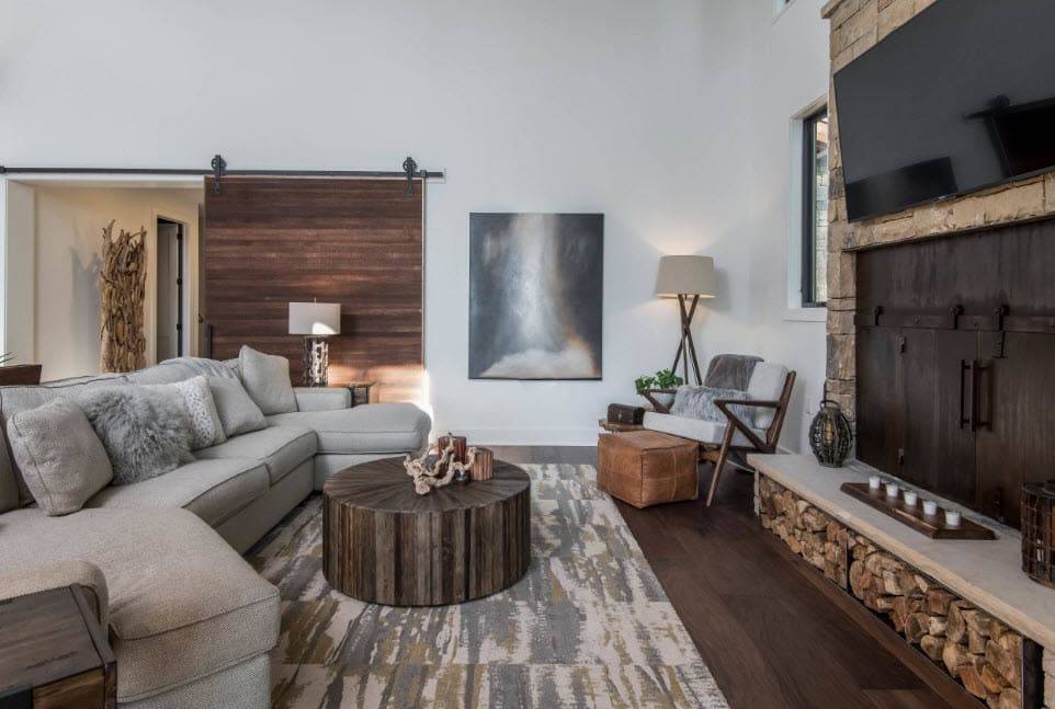 Причем сложно понять, чего в гостиной должно быть больше. Некоторые дизайнеры считают, что дерева. Но здесь все будет зависеть от вкусов владельцев. В цветовой палитре должны преобладать исключительно теплые оттенки: бежевые, карамельные, коричневые, кремовые, янтарные. Можно добавить немного цветового холода в виде серых, черных, белых штрихов.